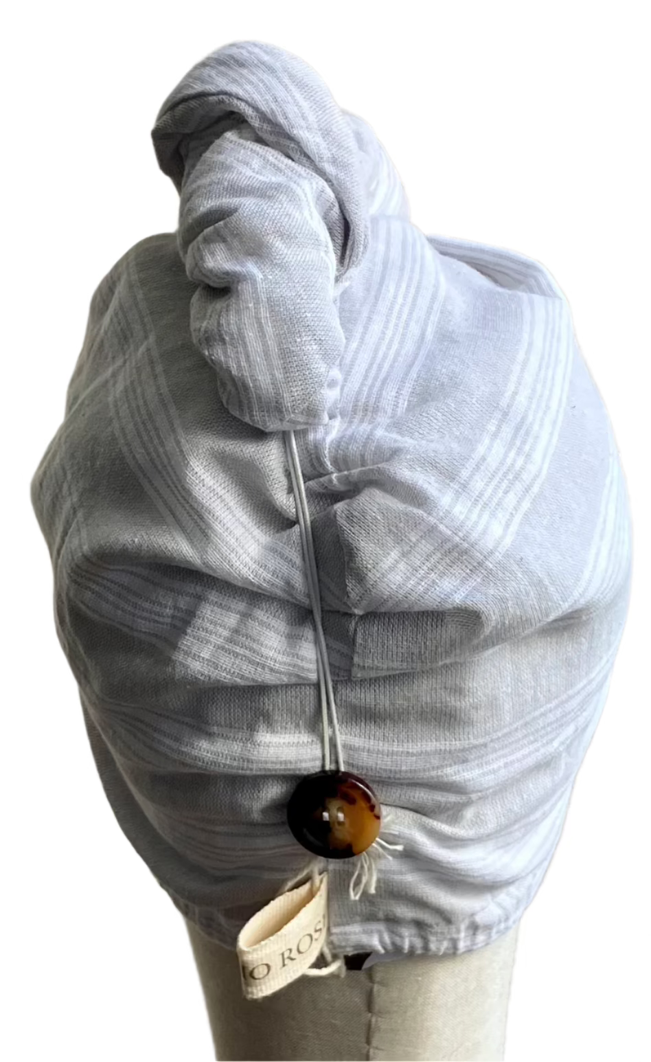 Our Hammam and waffle towel turbans are currently available in coral and white stripe or light grey and white stripe.
